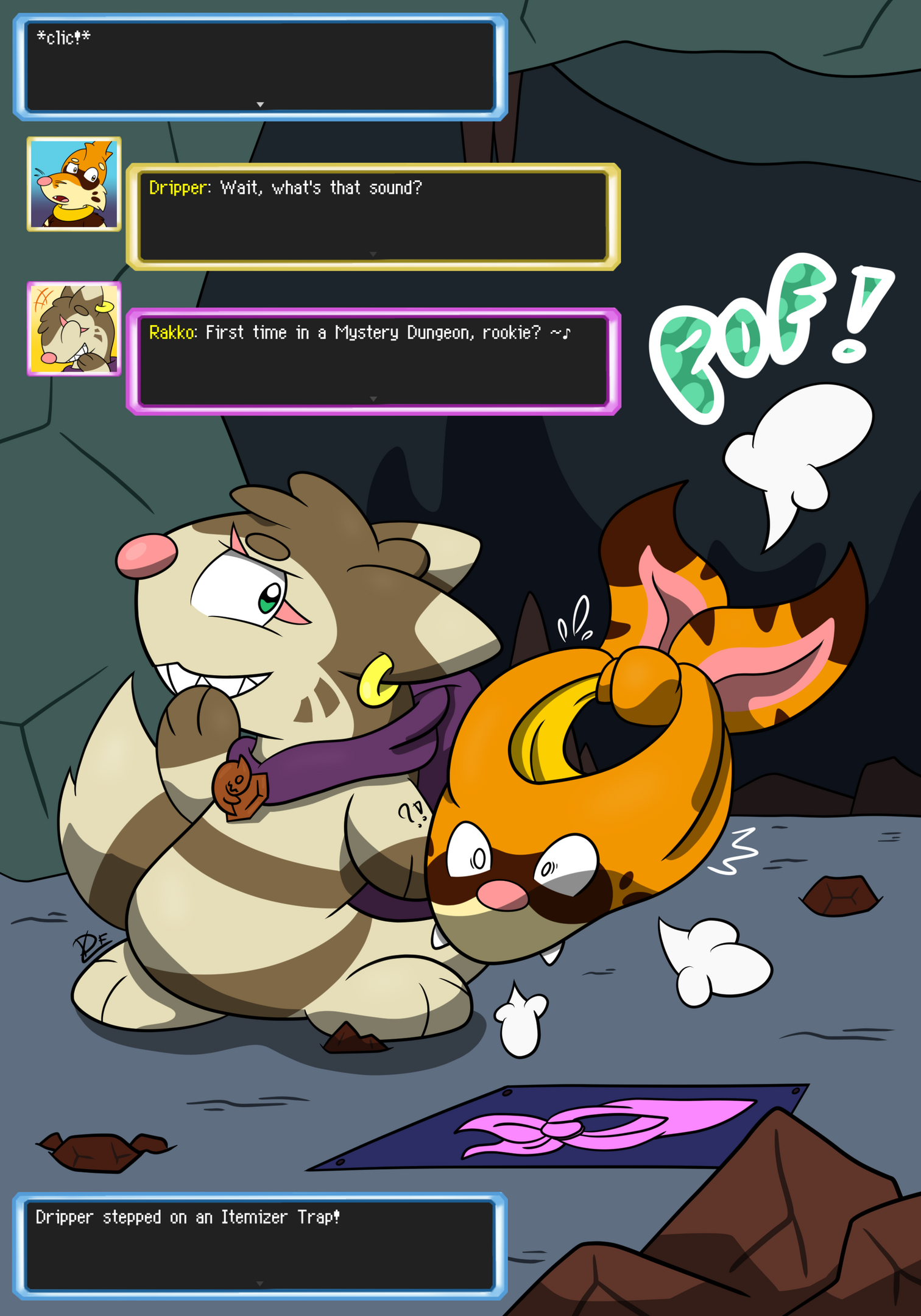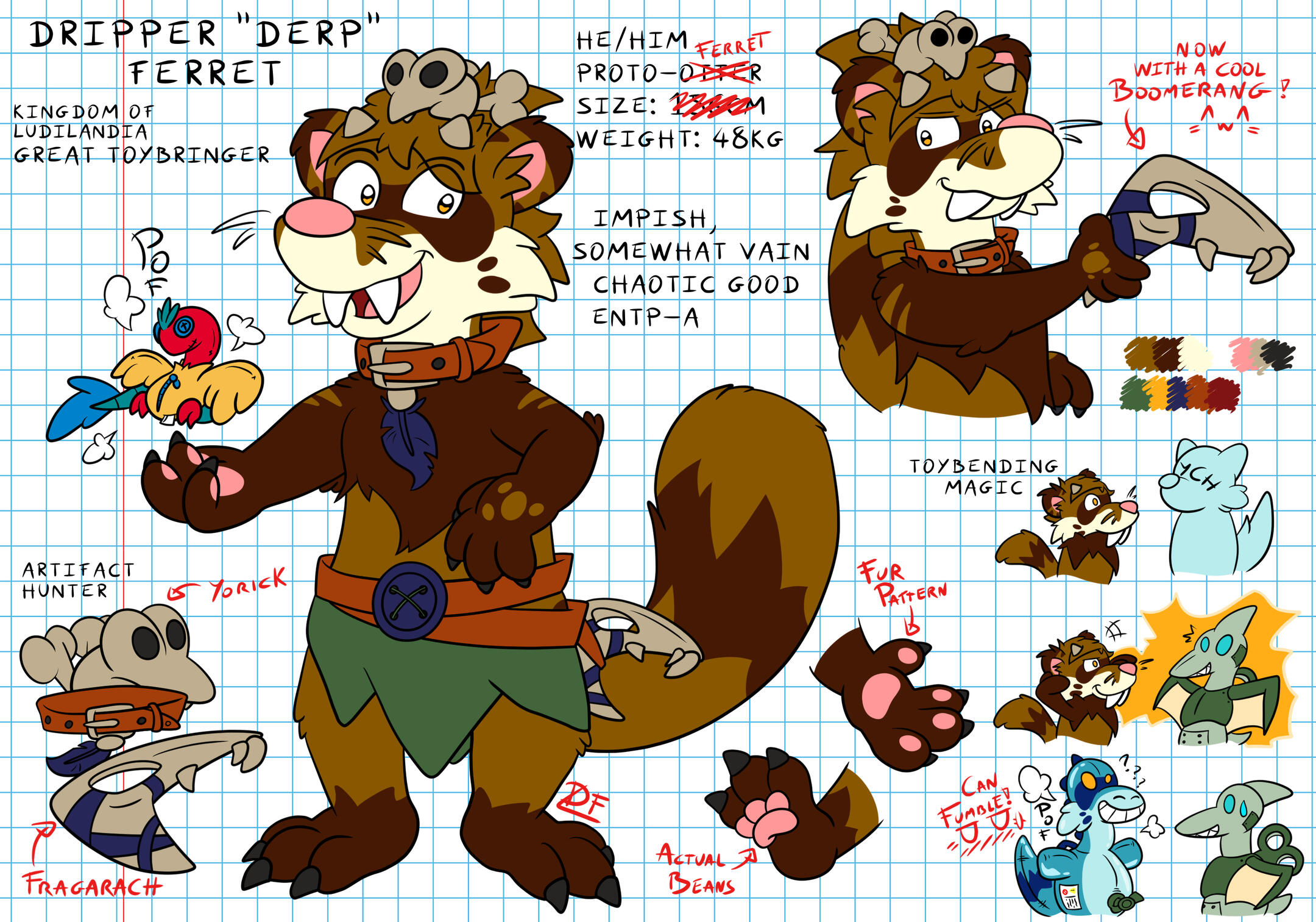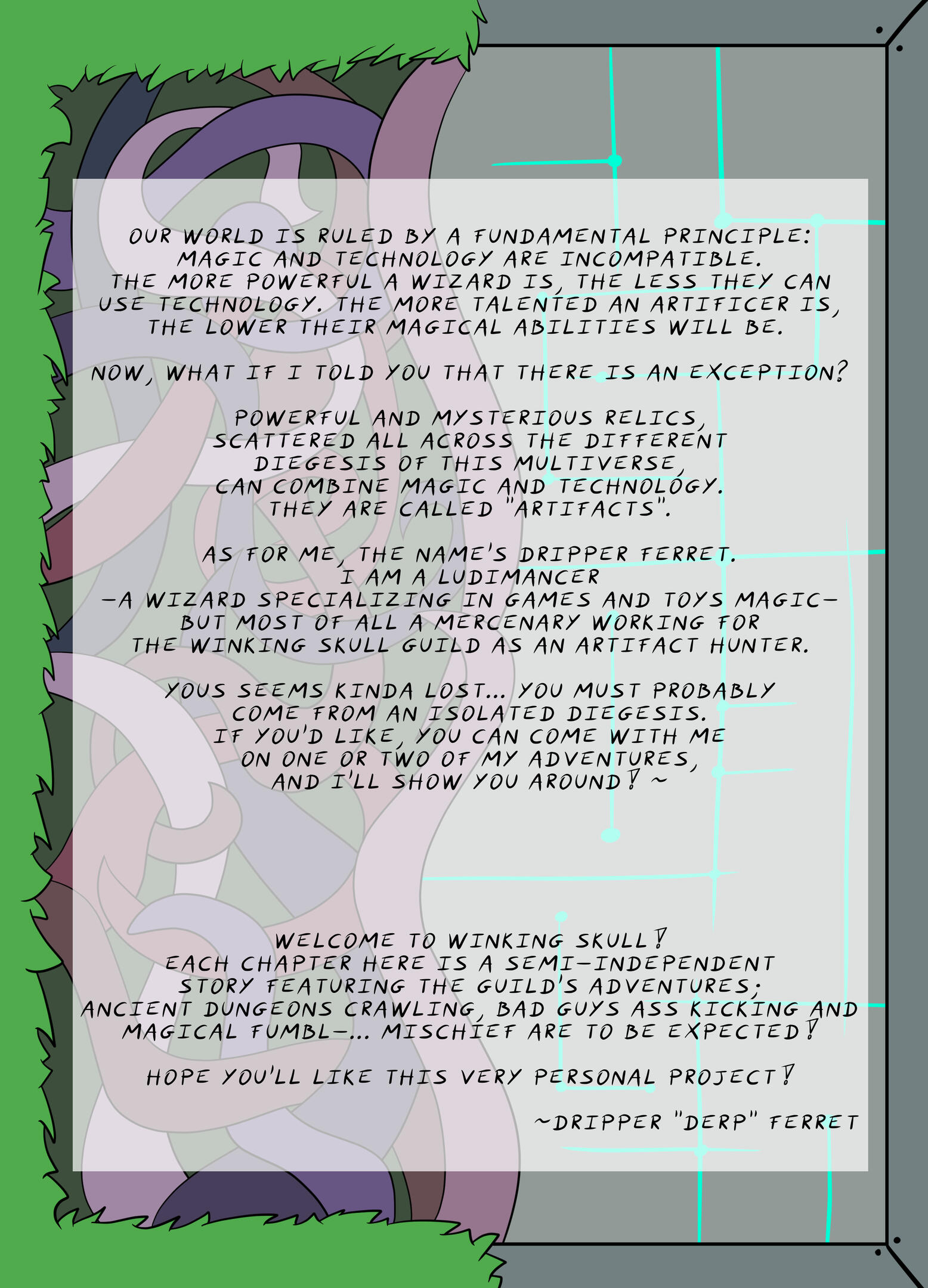 Welcome to my den, internet traveler! ~The name's Dripper “Derp” Ferret, French prehistoric mustelid, board/card/roleplaying games enthusiast and hobbyist artist (he/him). I am the author of Winking Skull, a webcomic where I tell the story of my adventures as a great toy wizard! I also draw various original stuff or fanarts but I have a particular interest for numerous toony/furry shenanigans: transfur, hypno, macro, ar, vore, etc. … If you’d like, I’d be more than happy to guide you through these peculiar lands! =^w^=Note: English is not my native language, feel free to let me know if you spot any spelling or grammatical mistake!